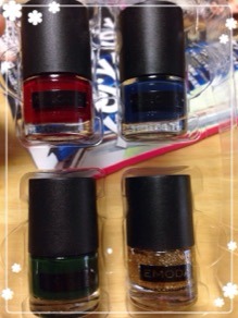 お試しミニサイズですが、バーガンディー、ブルー、グリーン、ゴールドの4色!