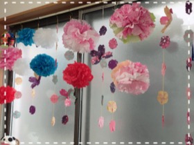 グリーンとピンクの2色のお花のポンポンゎ、さくらのペーパーナプキンで