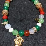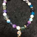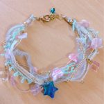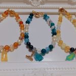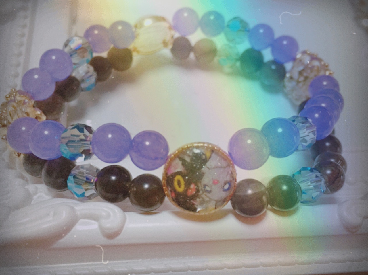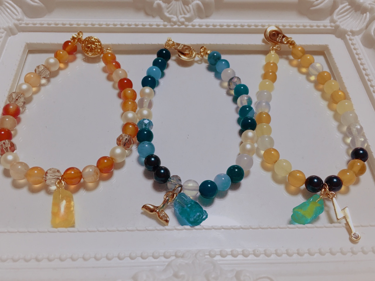 - ブースター、シャワーズ、サンダースをイメージして作った「ブイズ ブレスレット」シリーズ。ブースターはカーネリアン、パール、ガラスビーズ。シャワーズは、キャンディクオーツ、合成オパール。そして、サンダースは、イエローメノウ、ホワイトメノウに、スワロフスキーのナイトブルーのパールを使いました。チャームはレジンで作った小さい進化の石をつけてます。