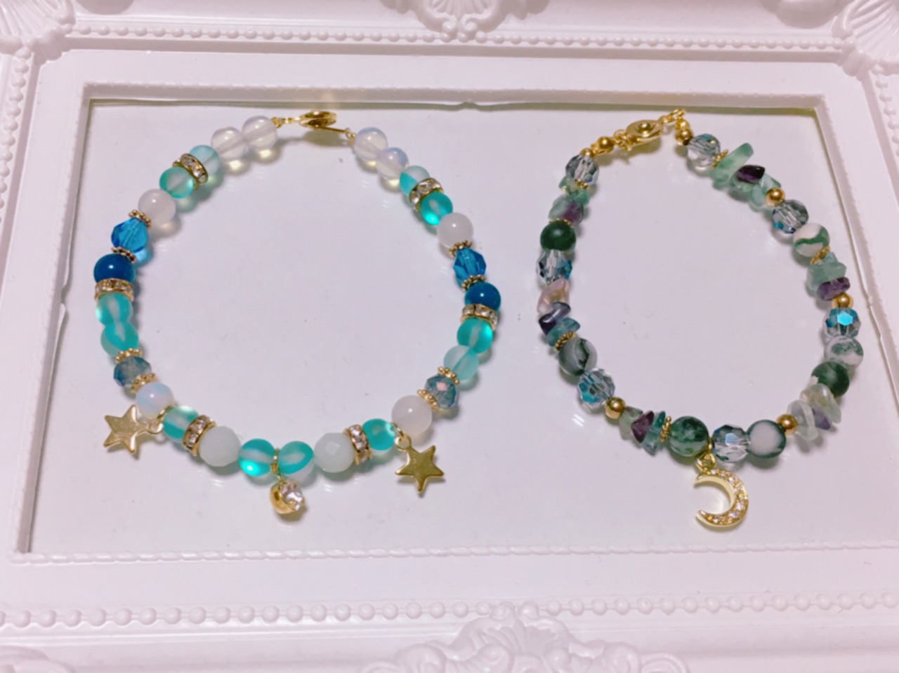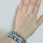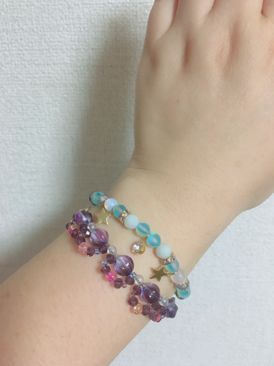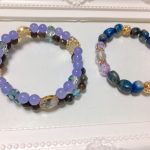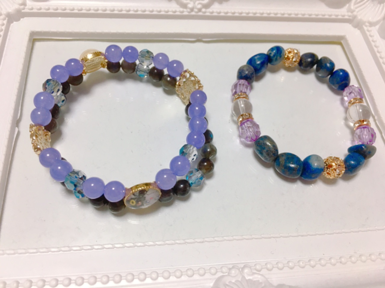 - 左 「真昼と月夜の進化」。ラベンダー色のカルセドニーとラブライトの2連ゴムブレスレット。ブラッキーとエーフィーをイメージ。右は「22時の海辺」。ラピスラズリと水晶のゴムブレスレット。このラピスラズリは、昔プレゼントで頂いたものだったんですが、ゴムが劣化して切れてしまったので、作り直しました。あてもなく夜ドライブしていた時に見た、海の色。