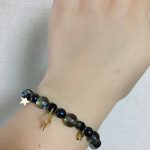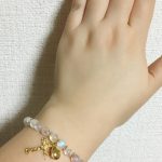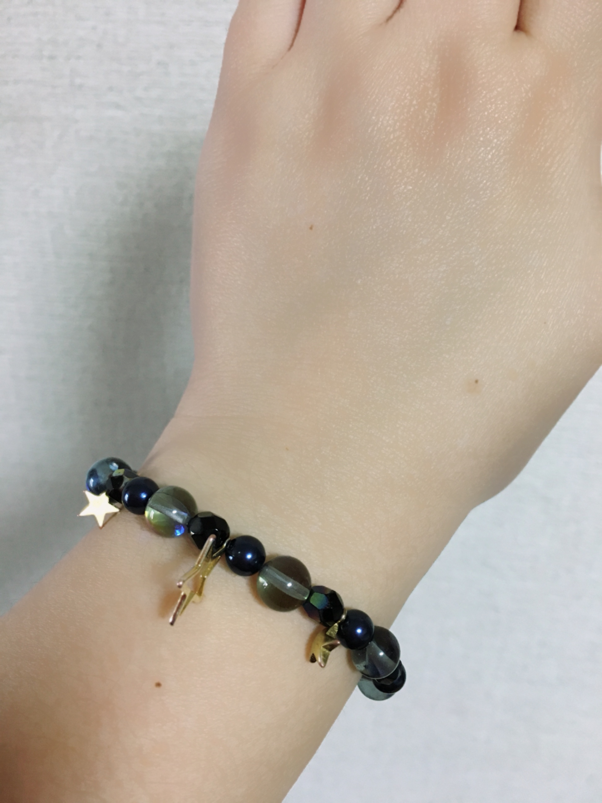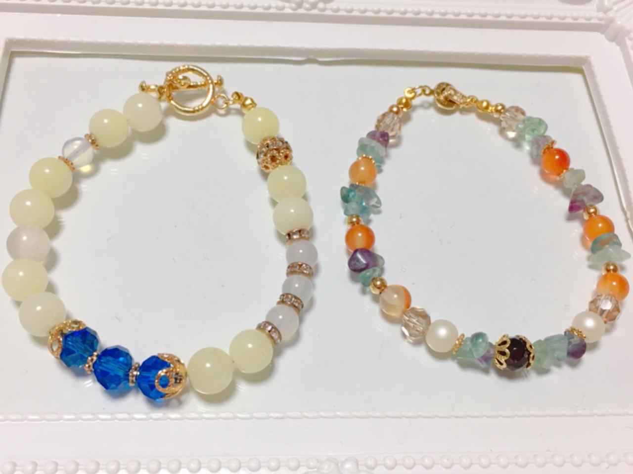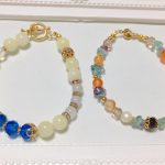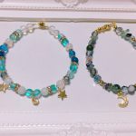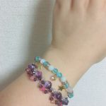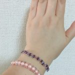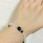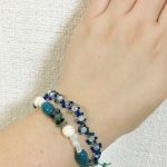 - 左 「真昼と月夜の進化」。ラベンダー色のカルセドニーとラブライトの2連ゴムブレスレット。ブラッキーとエーフィーをイメージ。右は「22時の海辺」。ラピスラズリと水晶のゴムブレスレット。このラピスラズリは、昔プレゼントで頂いたものだったんですが、ゴムが劣化して切れてしまったので、作り直しました。あてもなく夜ドライブしていた時に見た、海の色。