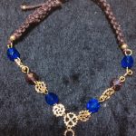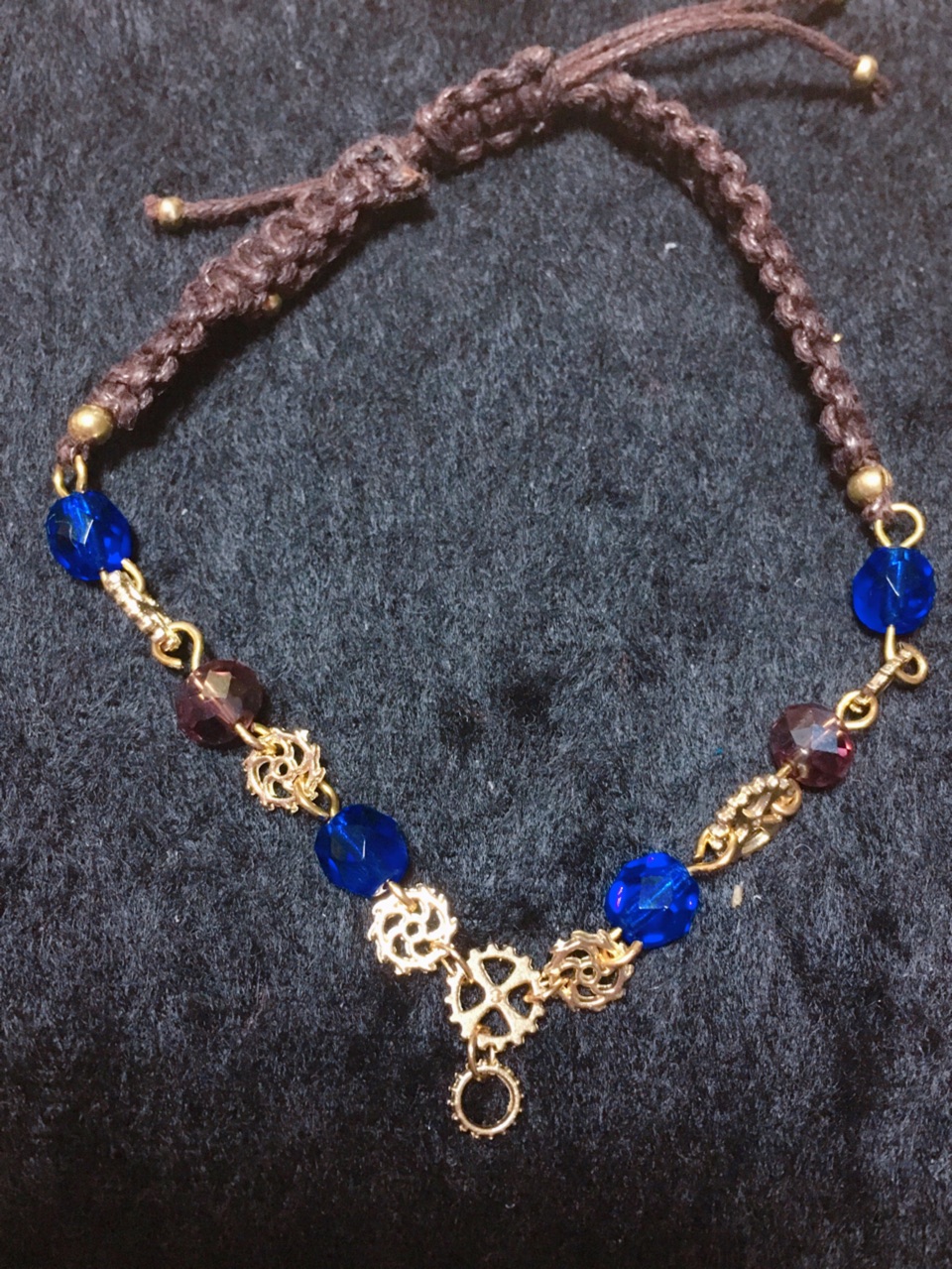 - 「夜空の歯車」。スチームパンクなパーツとチェコファイアポリッシュビーズを使いました。この色のファイアポリッシュ、めっちゃ大好きでよく使います。ワックスコードで平編みに。