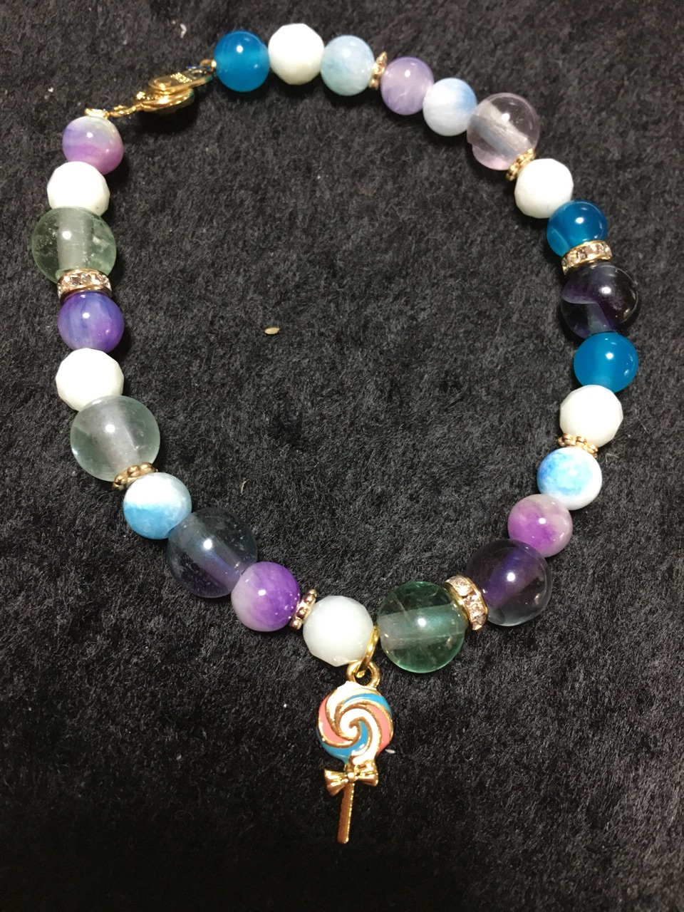 - 「あじさいレインドロップ」。レインボーフローライトとラベンダー色とアイスブルーのキャンディクオーツ、ブルーのカルセドニー、白のラウンドカットしたアマゾナイトを使ってます。こういういろ、だいすきなんですよね☆