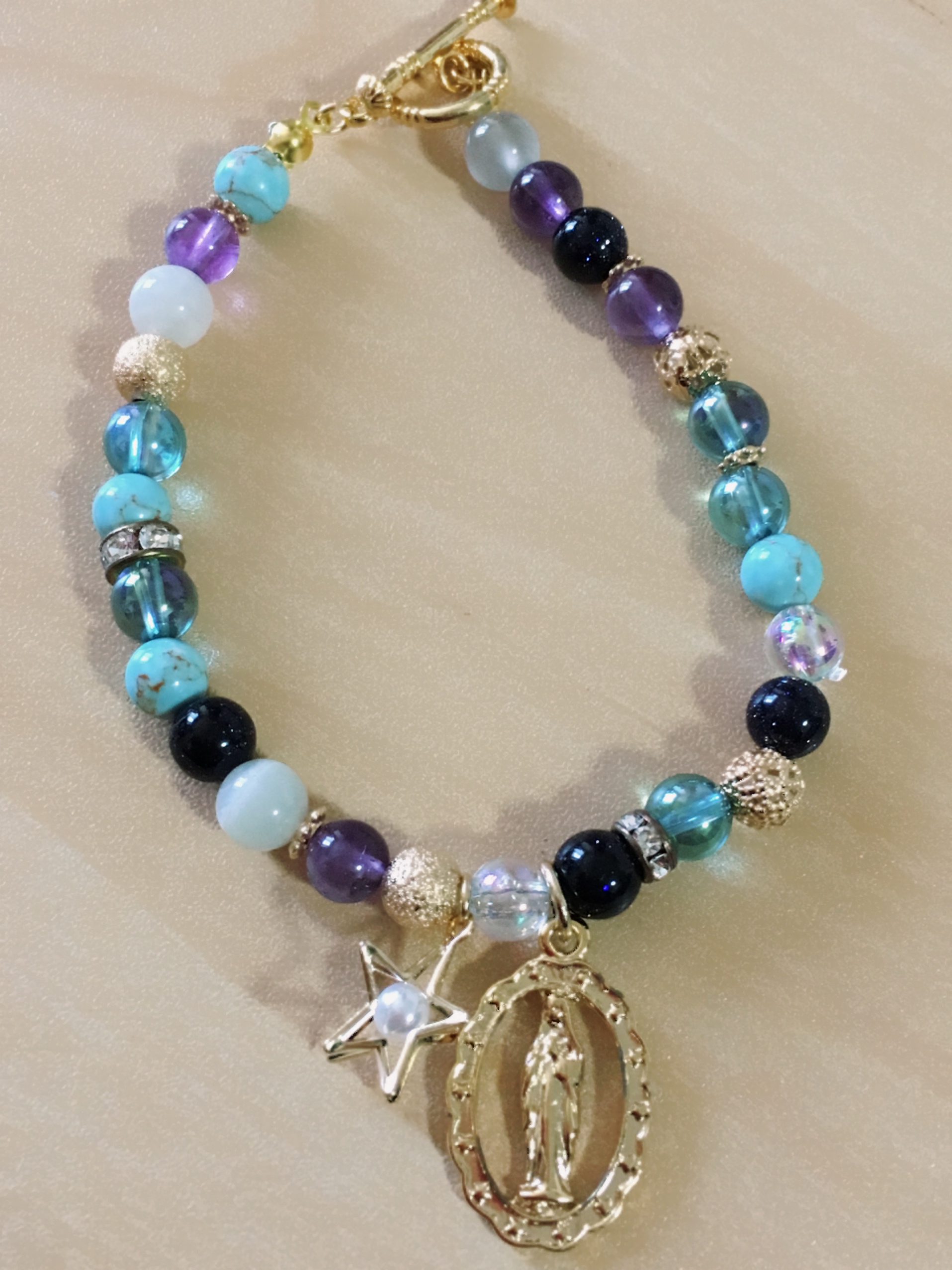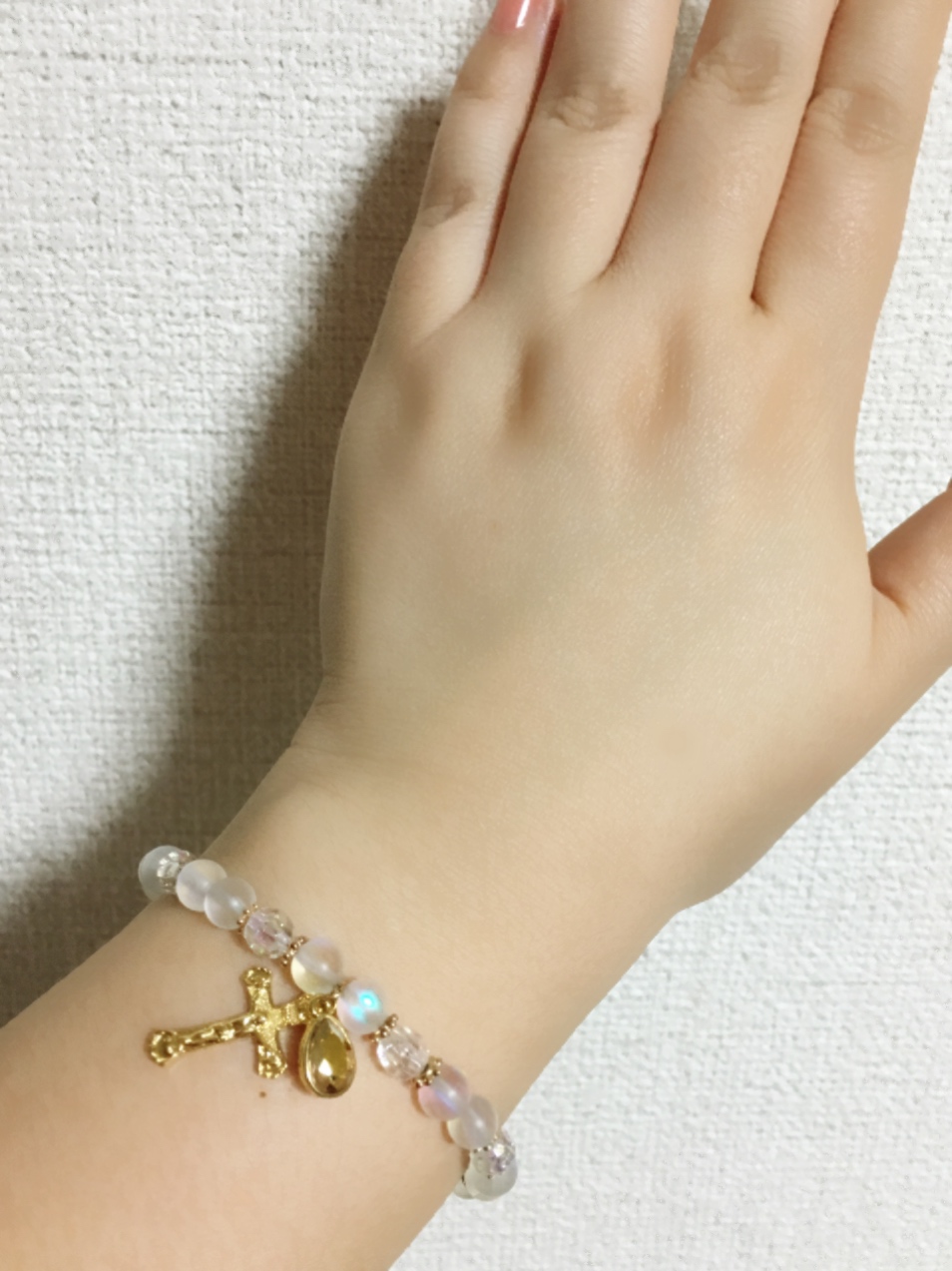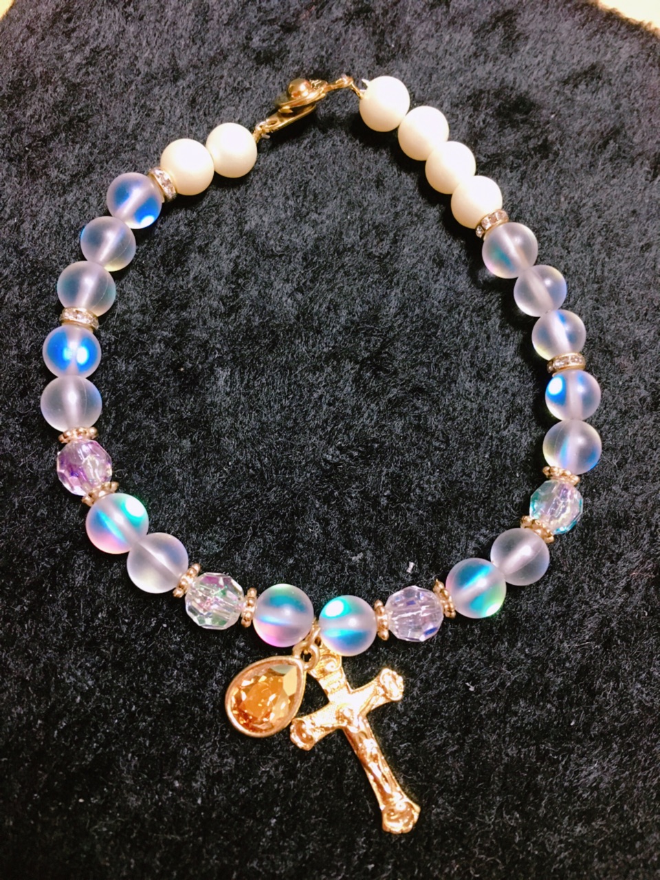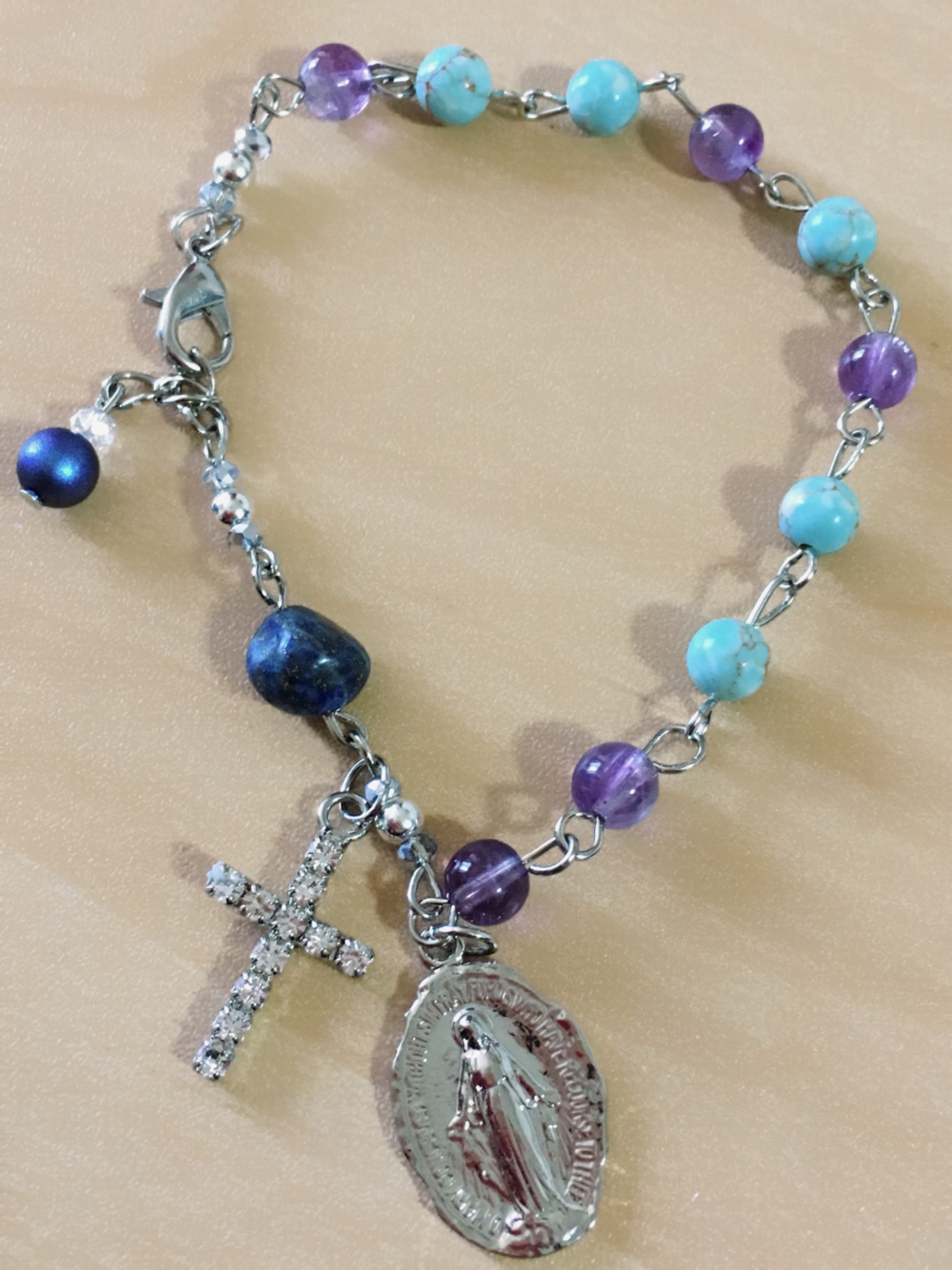 - 「手術がんばれ!」入院する知り合いの方に頼まれて作ったロザリオブレスレット。手術のお守り石のターコイズ、心身のリラックス効果があり、その人の誕生石でもあるアメジスト、痛みの軽減に効果があるラピスラズリを使いました。早く良くなってくださいね!