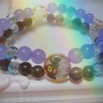 - 左 「8月のミルキーウェイ」ブルーのルナフラッシュとキャンディクオーツ、オパール、グレーブルーのガラスビーズを使いました。夏の星座が好きなので、ミルキーウェイをイメージしてます。右は、「雨上がりの月夜」。ホワイトモスアゲートとレインボーフローライトのさざれ石を使いました。雨上がりの夜半のドライブで、たまたま通った湖畔の上に月が出ていて、こんな湖面の色だったんです。