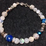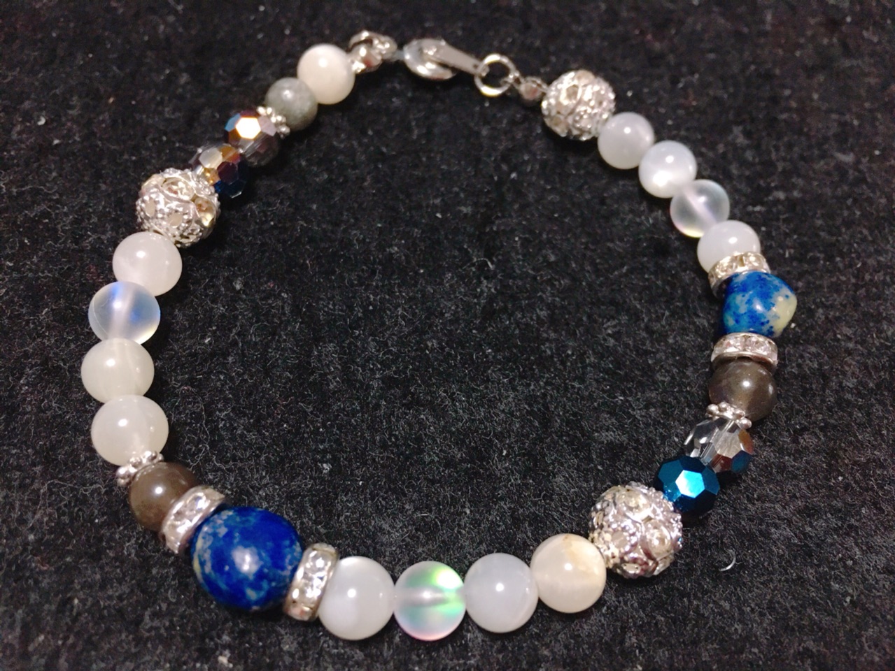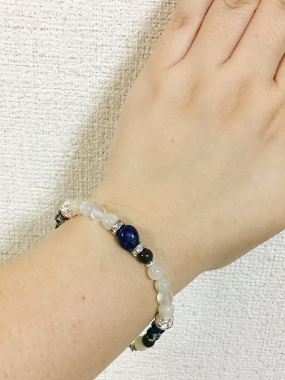 - 「ブルームーン」。誕生石のムーンストーン、マッドカラーのルナフラッシュ、ラピスラズリとラブライトをポイントに。ワカドリの好きな石と色でまとめました。