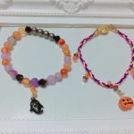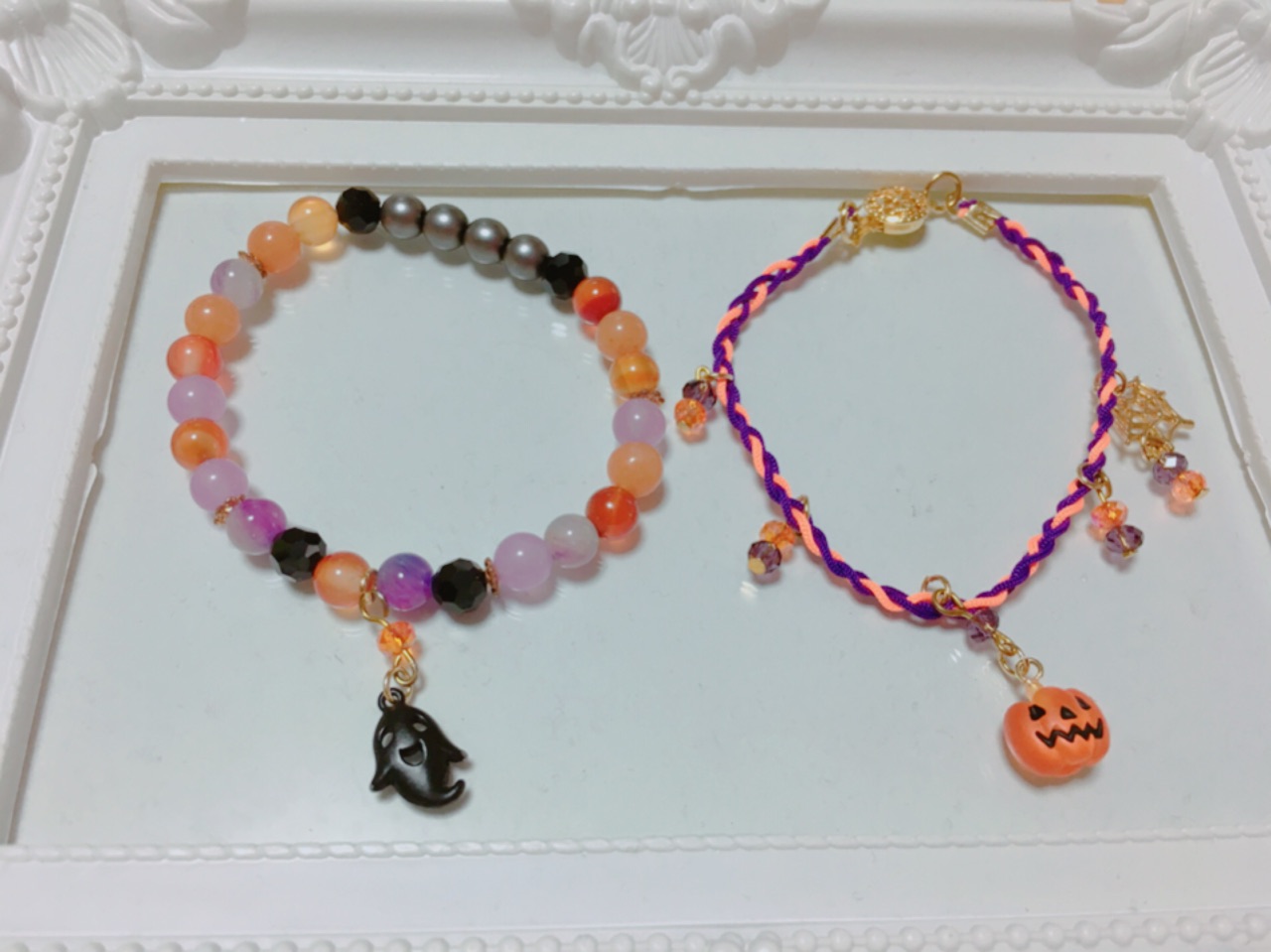 - 「トリックオアトリート!」。ハロウインカラーブレスレット。左は、ラベンダー色のカルセドニー。オレンジ色のカーネリアン、ブラックのガラスパール。右はハロウインカラーのリリアンをみつあみミサンガにしました。カボチャのチャームがかわいい♪