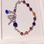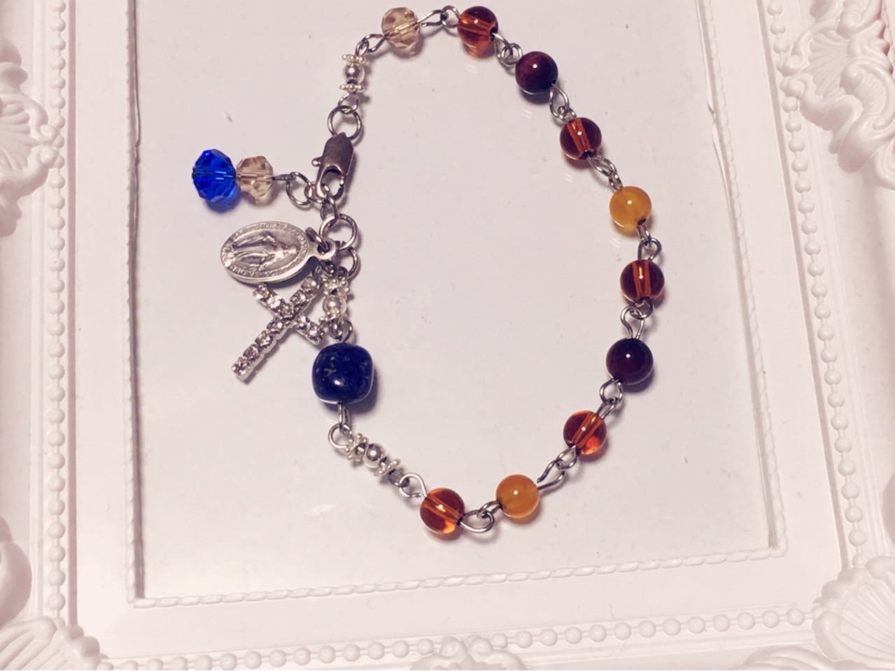 - 「青い夜琥珀の祈り」。ロザリオブレスレットです。チャームにはメダイを使ったので、実際にお祈りに使えますよー。レッドタイガーアイとイエローメノウ、琥珀色のガラスビーズ。ほんとは、ガラスビーズじゃなくて琥珀を使いたかったなあ。