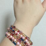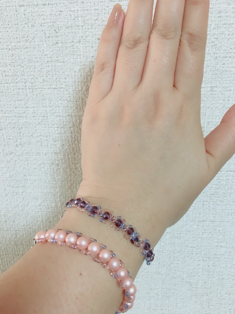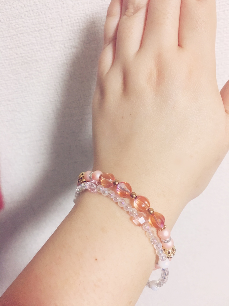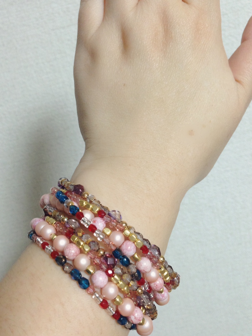 - チェコビーズメロン、すっごい好きなんです。ピンクのガラスパールと、オーロラカラーのガラスビーズの2連ブレスレットです。貴和製作所で見つけたものは、色が選べなくて全色買っちゃいました。