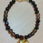 - 「宵闇の足音」。オニキス、クリアなブラウンのスモーキークオーツ、ガーネットのチェコファイアビーズを使いました。チャームには鈴。イメージはもちろん「いっぺんしんでみる・・?」