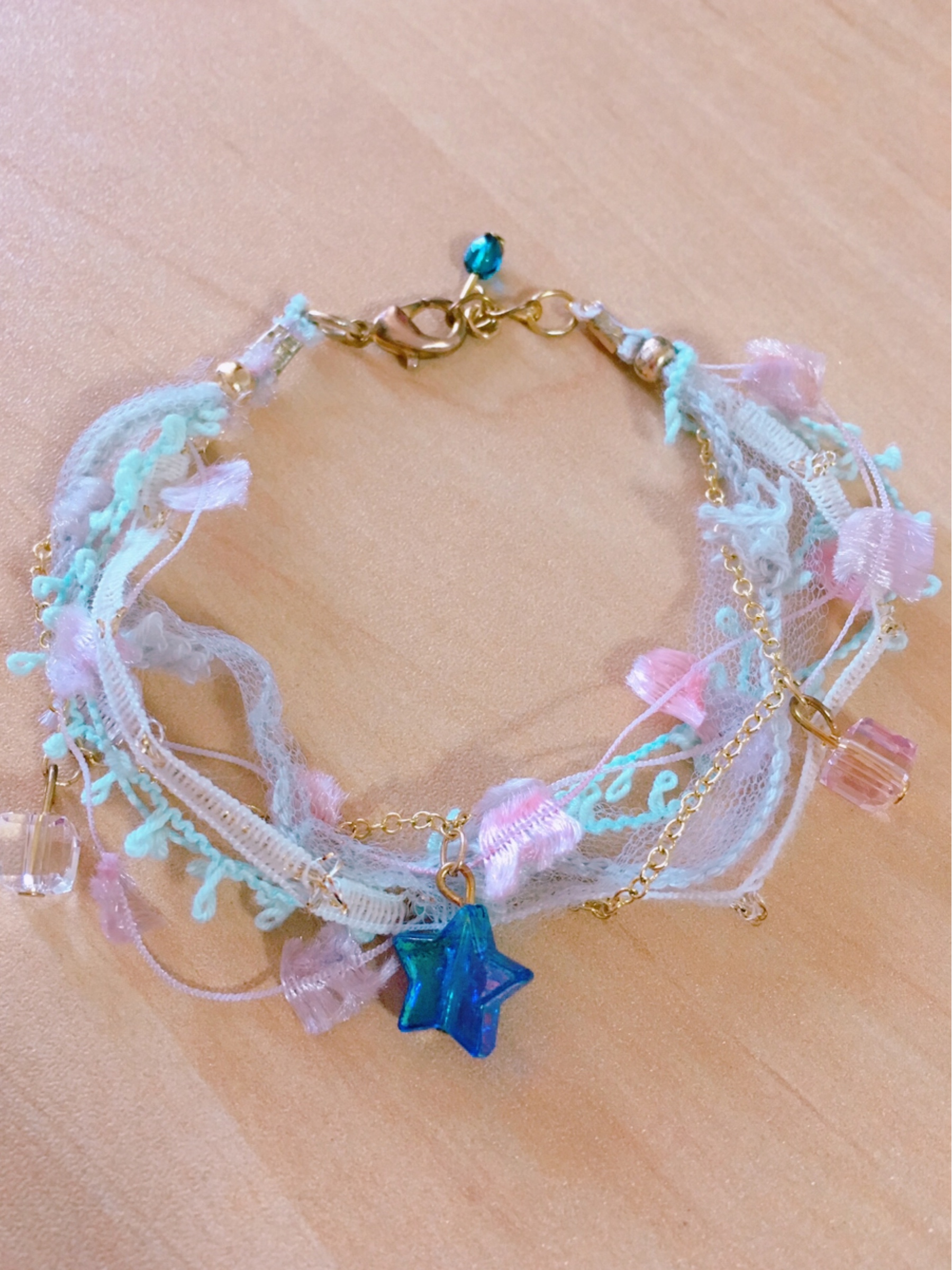 - 「朝焼けの忘れ物」アブリル糸とチェーンと星とキューブのビーズでテキトーに。オールして見上げた朝焼けにポツンと星の忘れ物が見えました。その時の色。