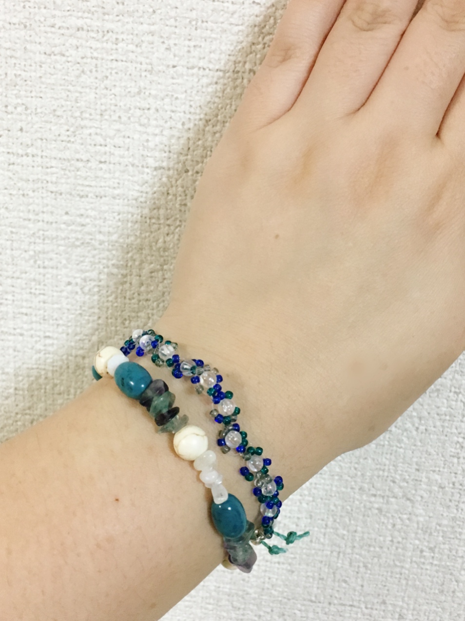 - ダイソーのビーズでテキトーに編んでみたブレスレットです。