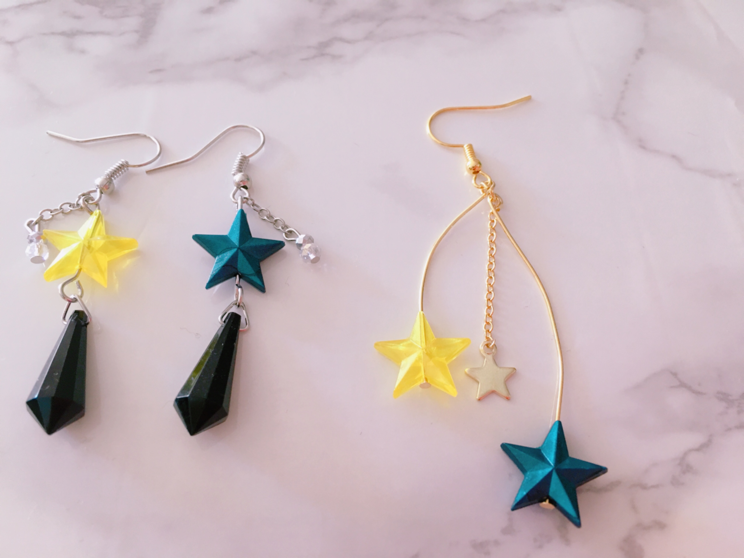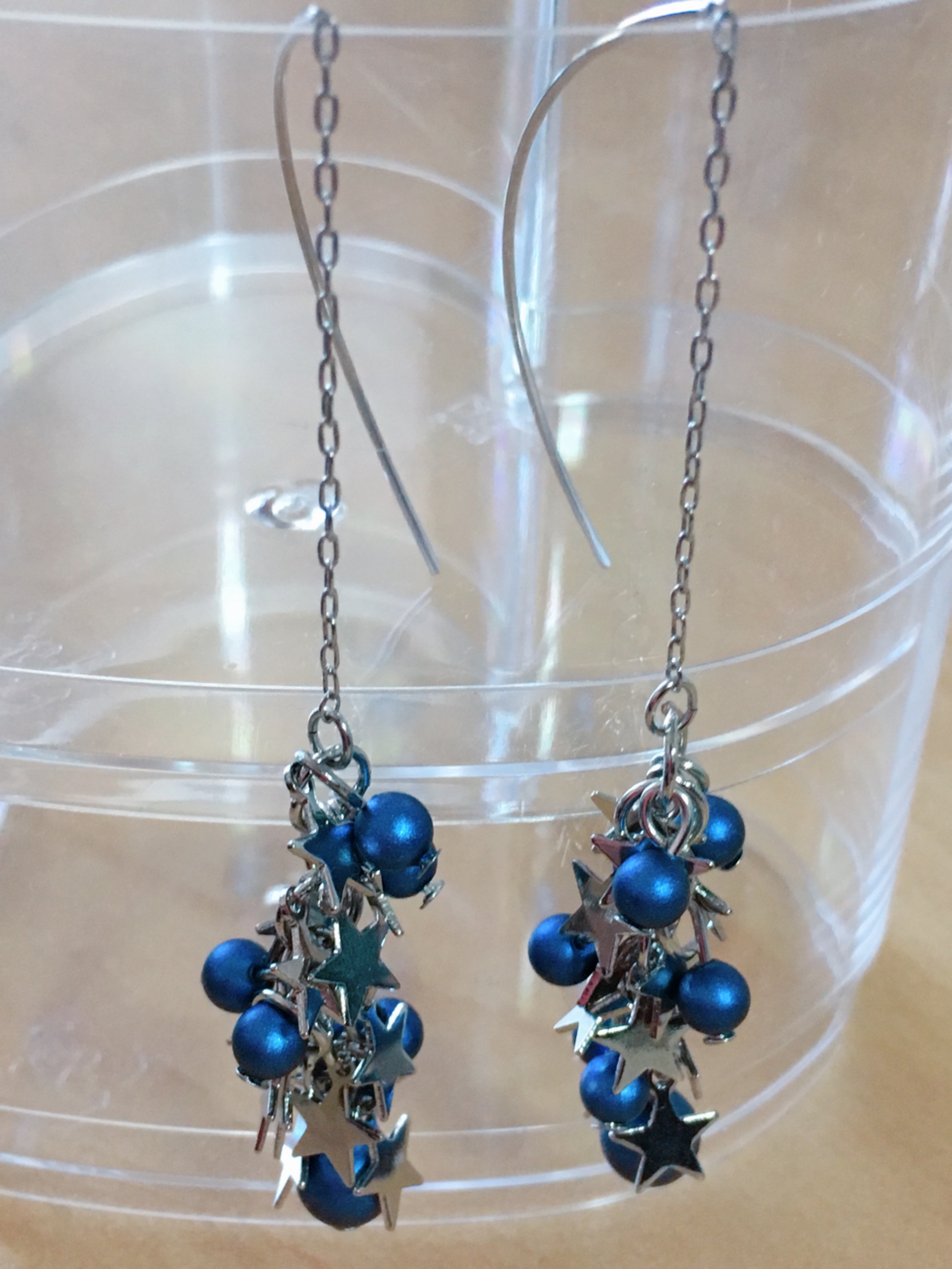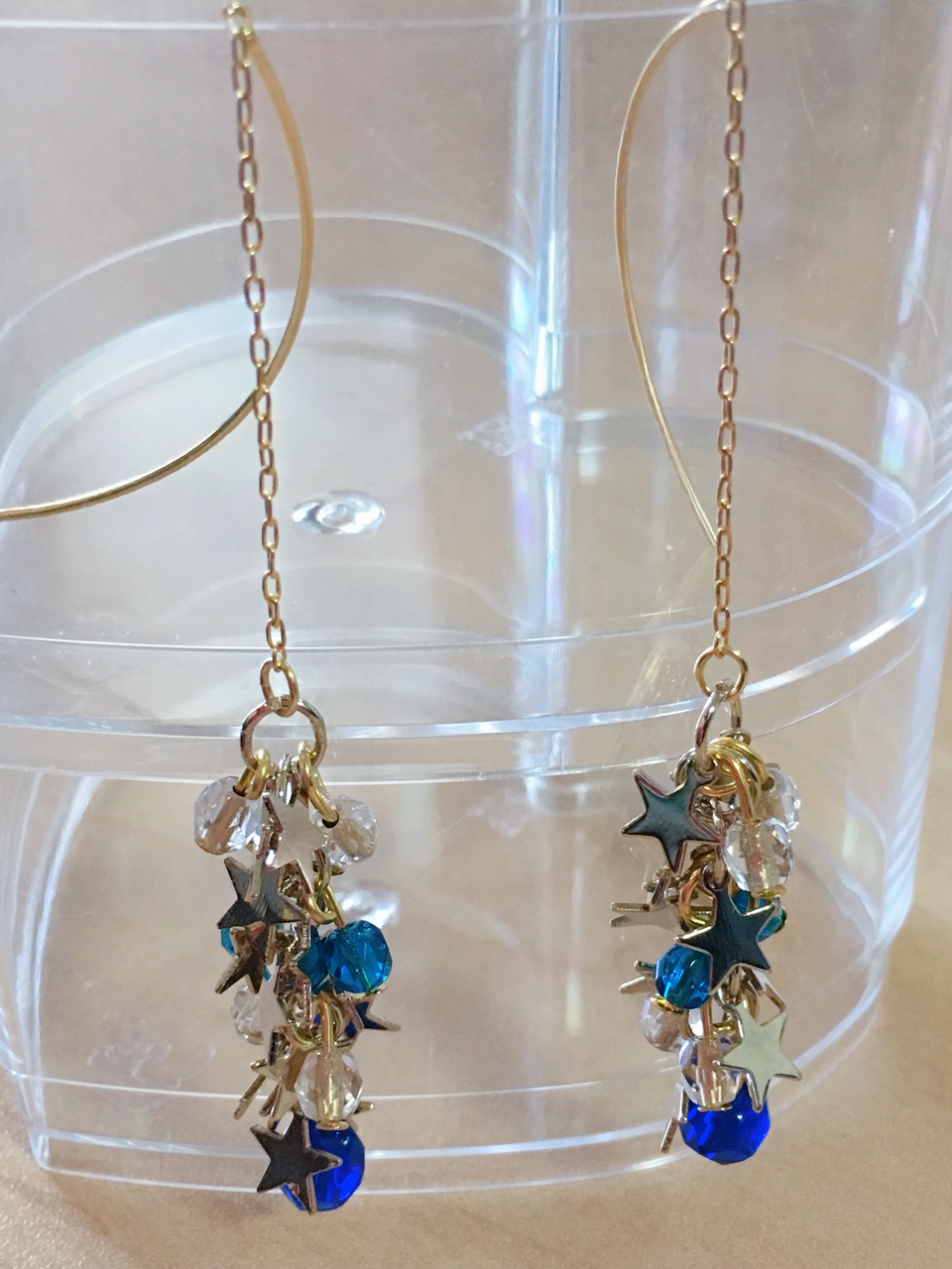 - 左 ドイツ製アクリルパーツを使いました。漆黒の夜空に流れ星が飛びます。 右 片耳のスターピアス 貴和製作所のレシピ。これを店舗で見たとき、一目惚れしてその場でパーツを買い、作りました☆