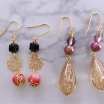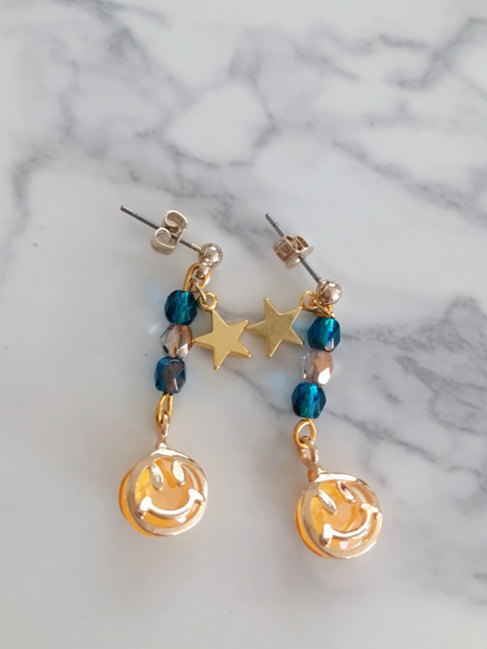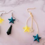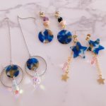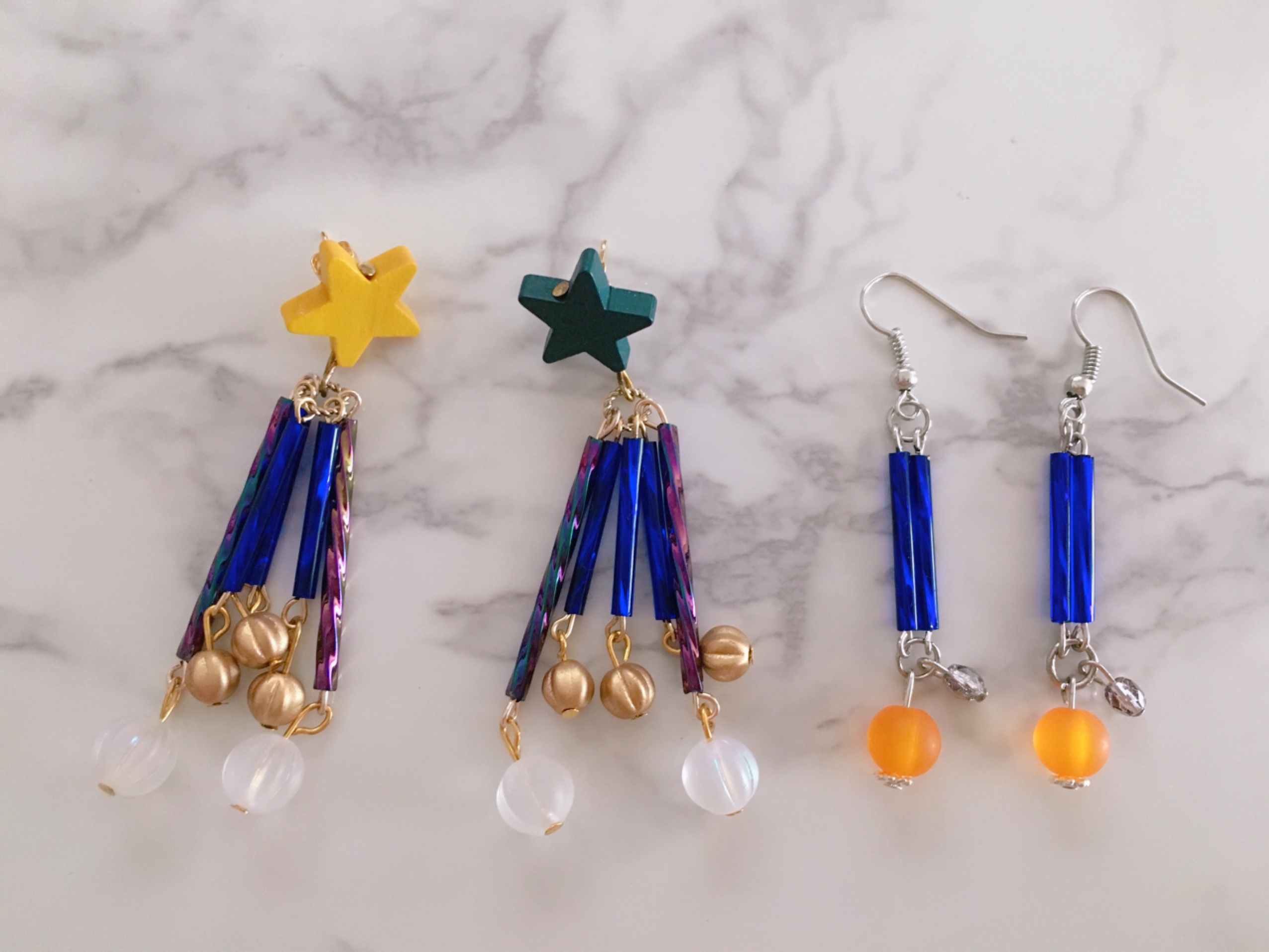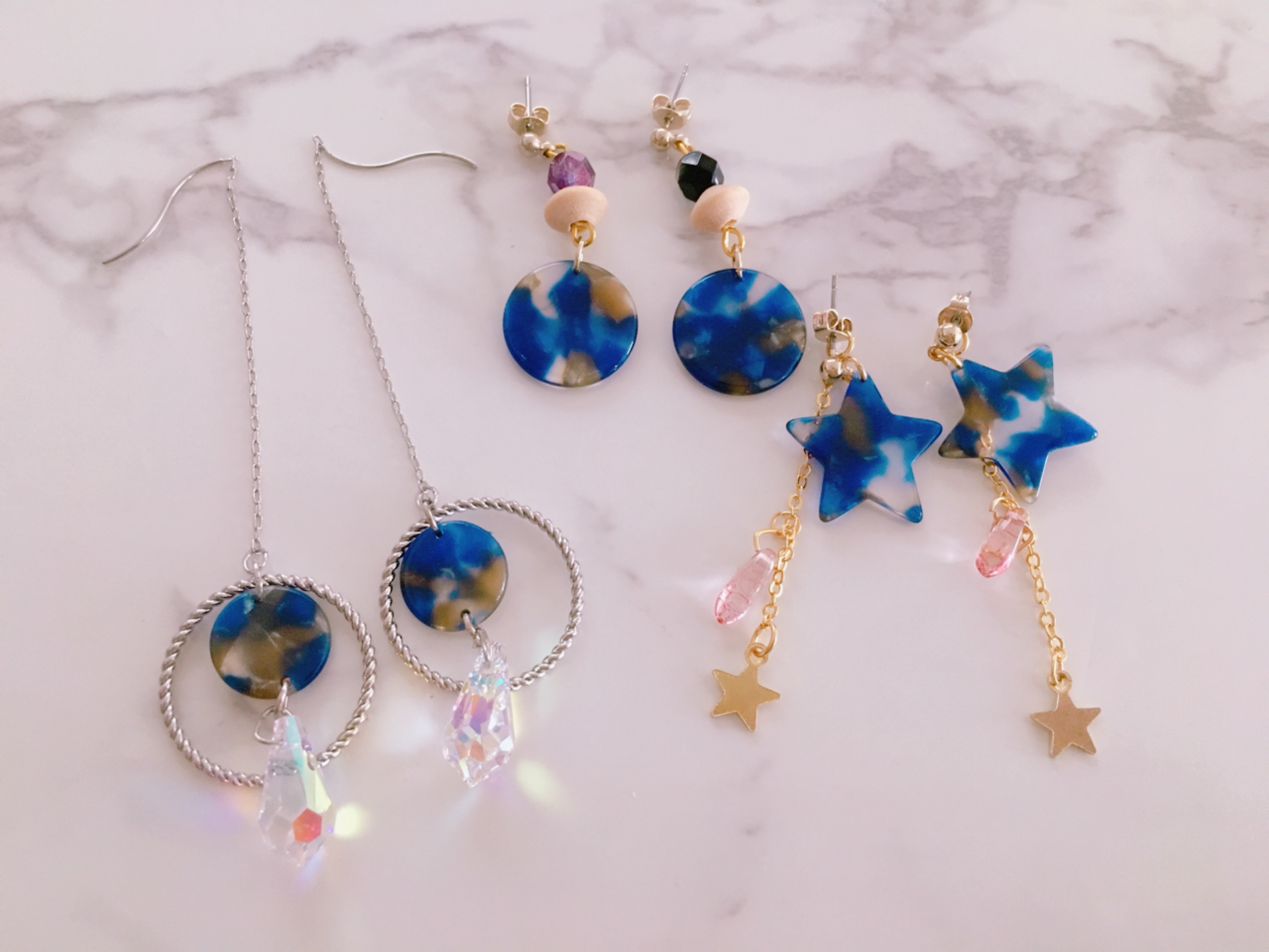 - 左 ドイツ製アクリルパーツを使いました。漆黒の夜空に流れ星が飛びます。 右 片耳のスターピアス 貴和製作所のレシピ。これを店舗で見たとき、一目惚れしてその場でパーツを買い、作りました☆