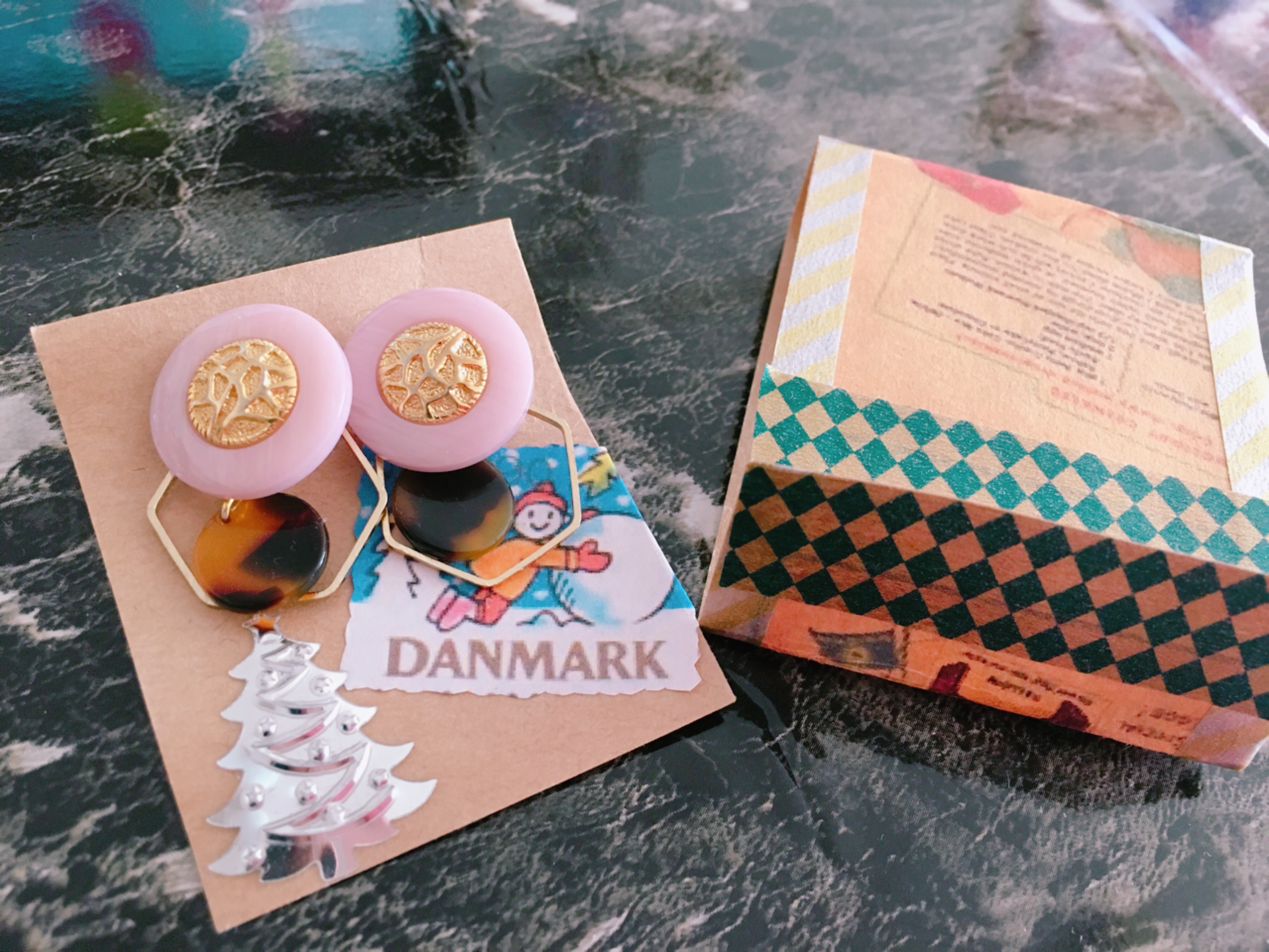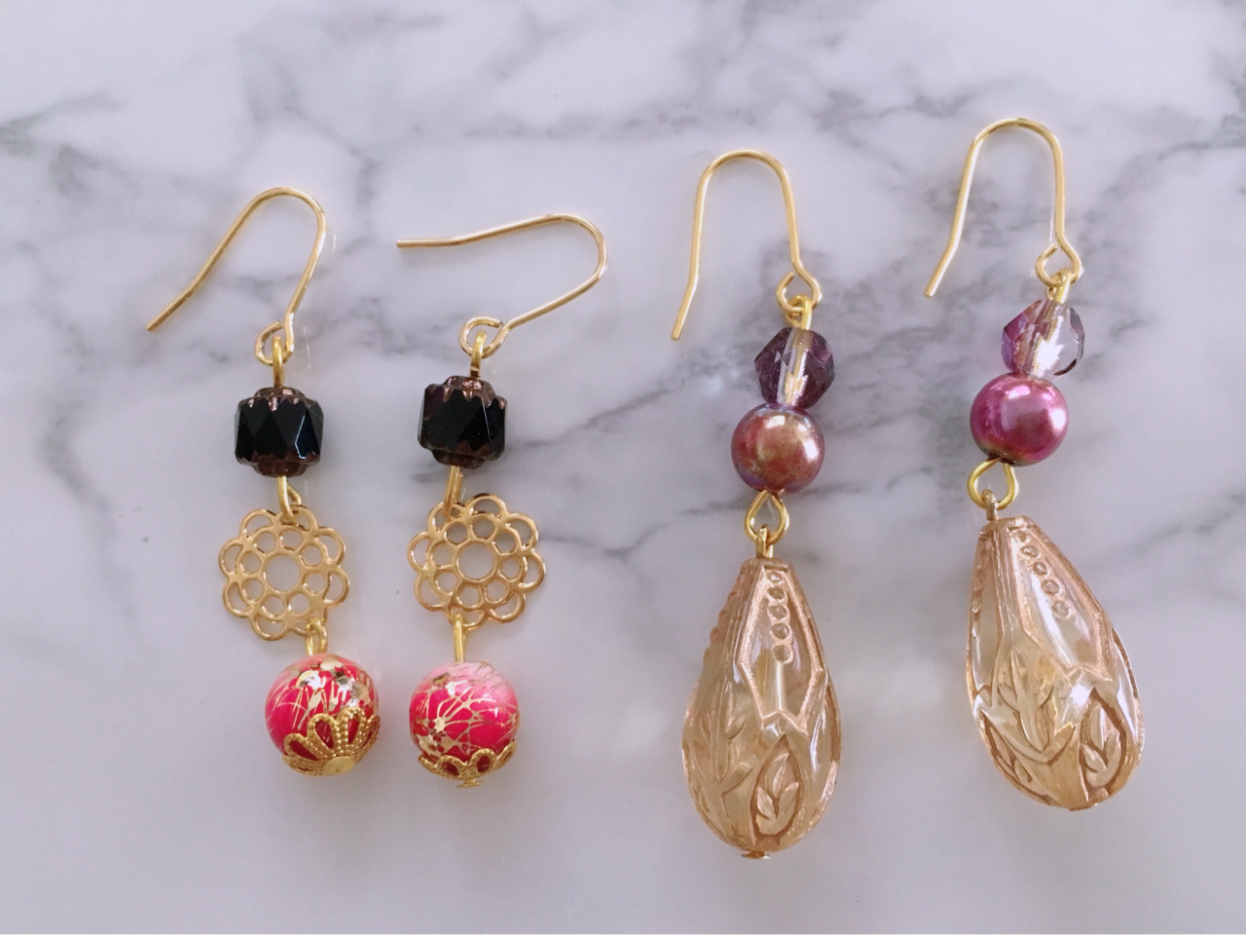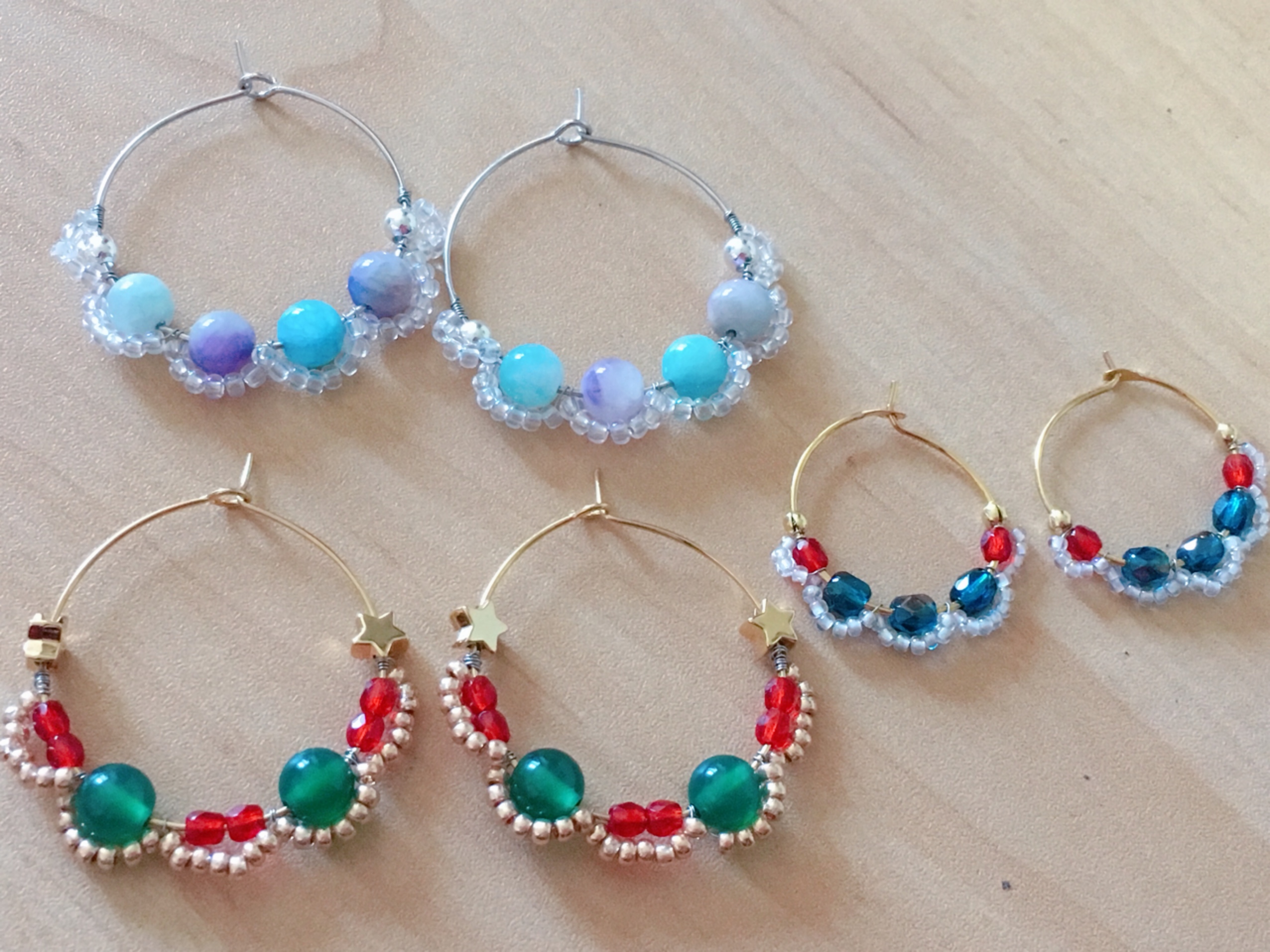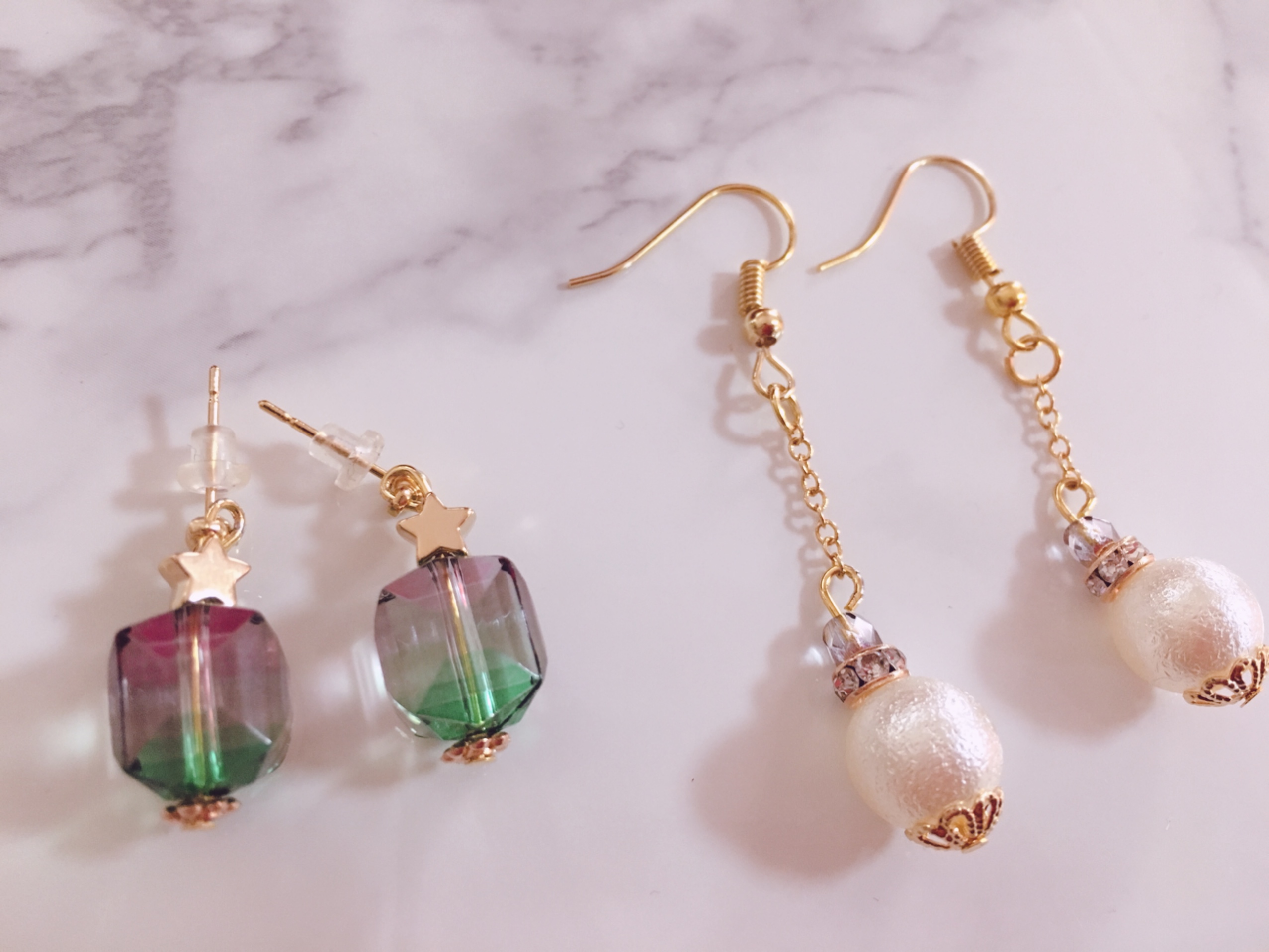 - 左 ヴィトライユビーズを使ってます。 右 コットンパールとロンデルを使った華やかなピアスです。どちらも友人へのクリスマスプレゼントです☆