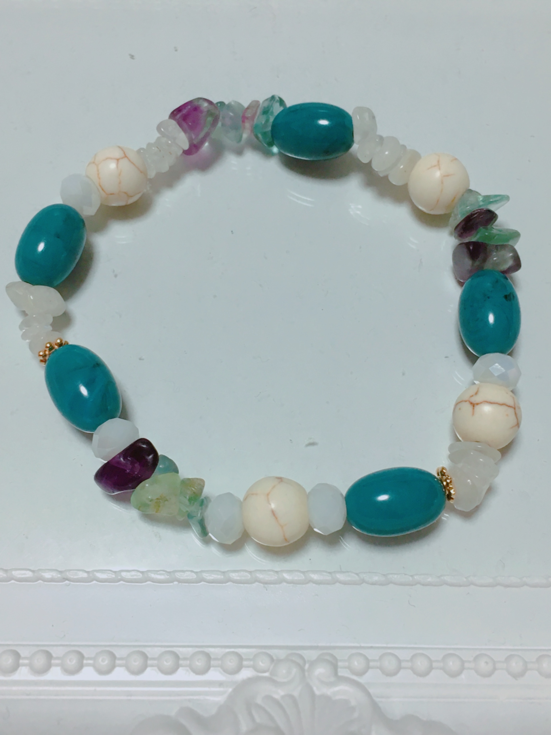 - 「なつのお嬢さん」。ナツメ型のターコイズ、レインボーフローライト、ムーンストーンのさざれ石を使いました。夏色のワンピースが似合うお嬢さんです♪