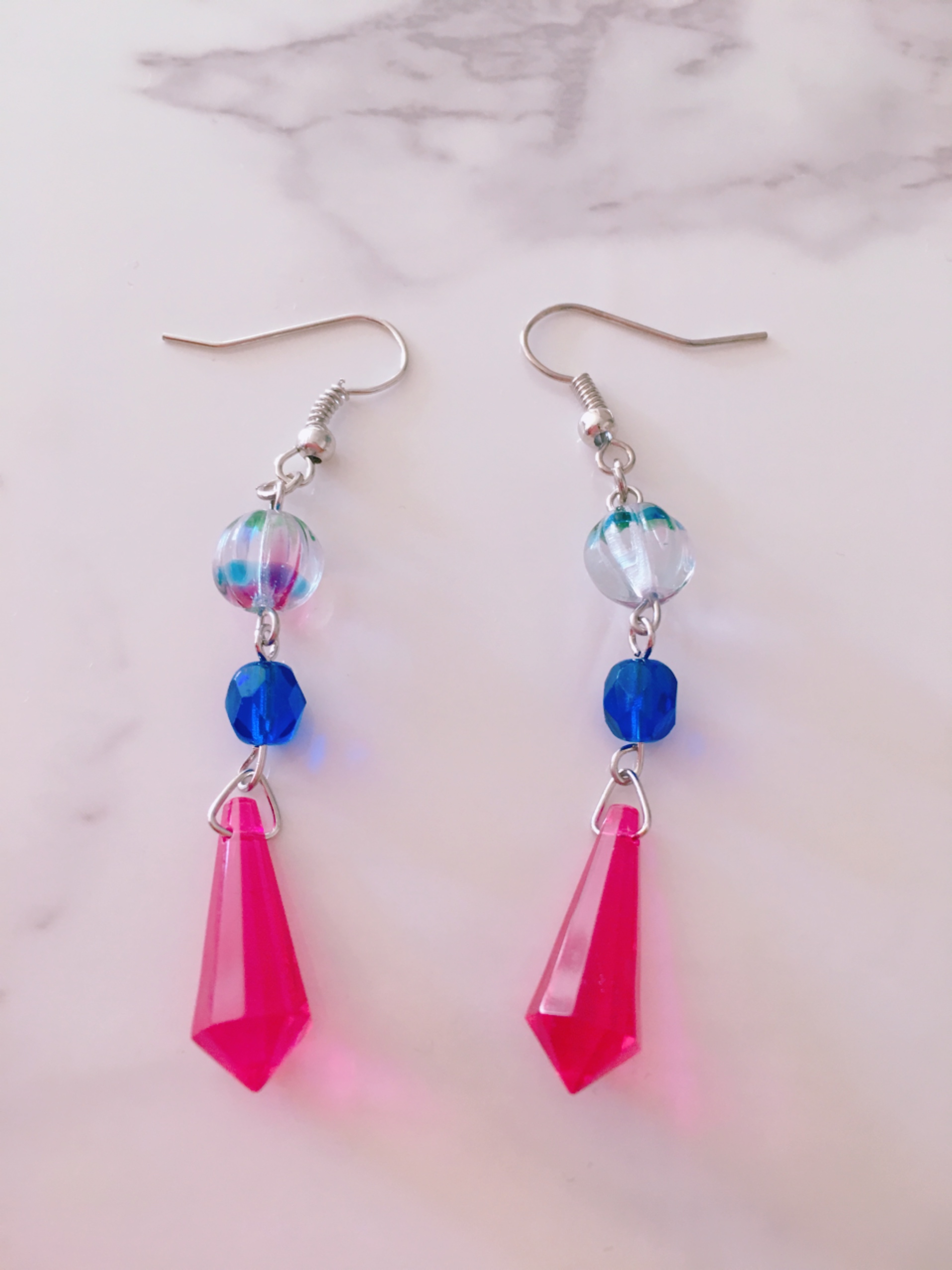 - 夏っぽい風鈴をイメージしました。別名「ちんりーんピアスw」。チェコメロンビーズ、チェコファイヤビーズ、ドイツ製アクリルパーツを使用してます。チェコビーズ大好きなんですよね。ピンク×ブルーの色合わせが、おもちゃっぽくてかわいい♪