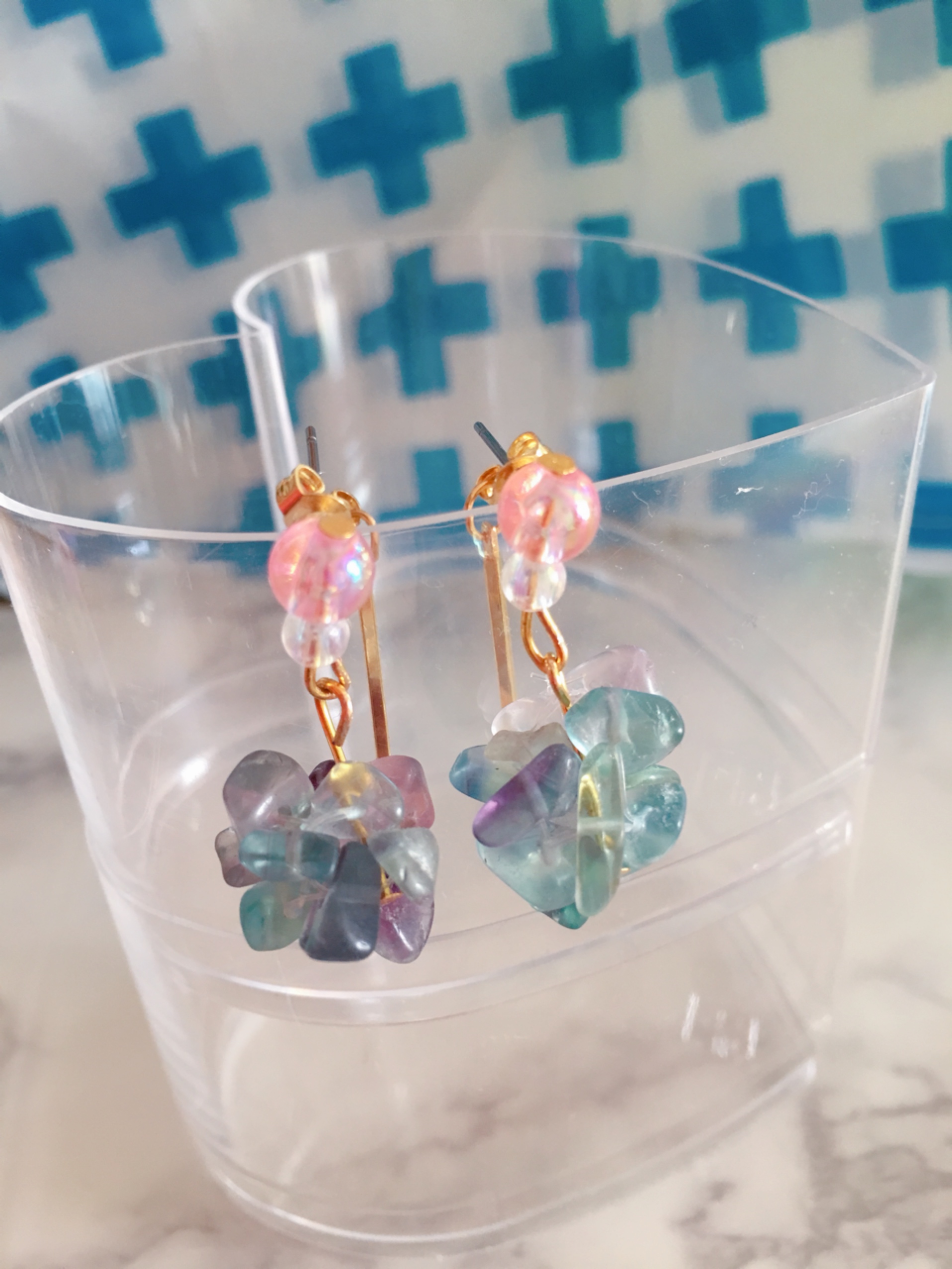 - 大好きなレインボーフローライトのさざれ石をつかいました。お花っぽく見せたかったんだけどちょいビミョー?