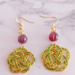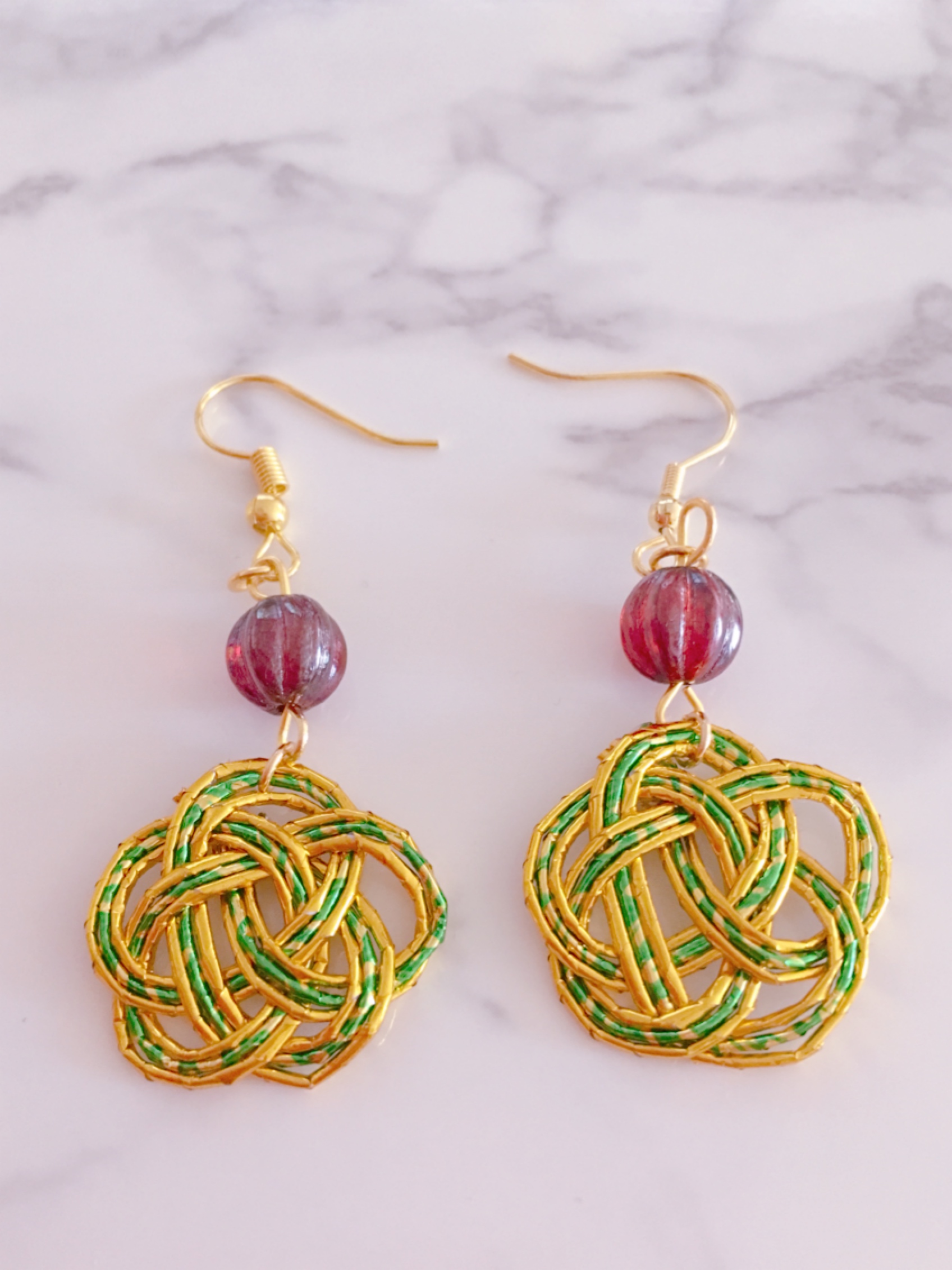 - 水引ピアスシリーズ。平梅結びに、チェコメロンビーズを組み合わせました。お正月につけてて、親戚の人から褒められました☆