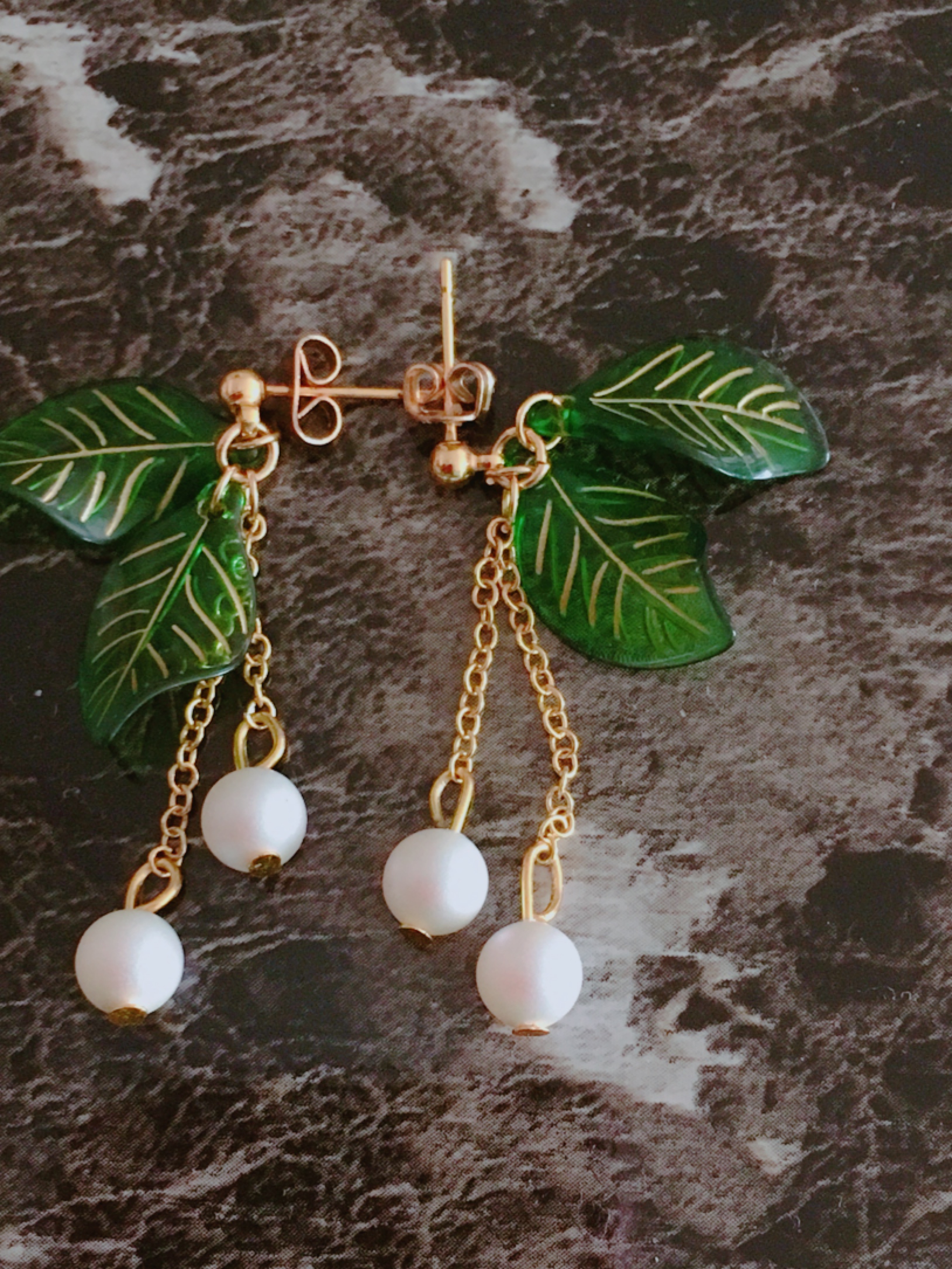 - スズランのピアス。スワロフスキーのパールの色に一目惚れして作ってみました。友人が気に入ってくれたので、同じのをもう一個作ってプレゼントしたよ☆