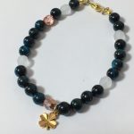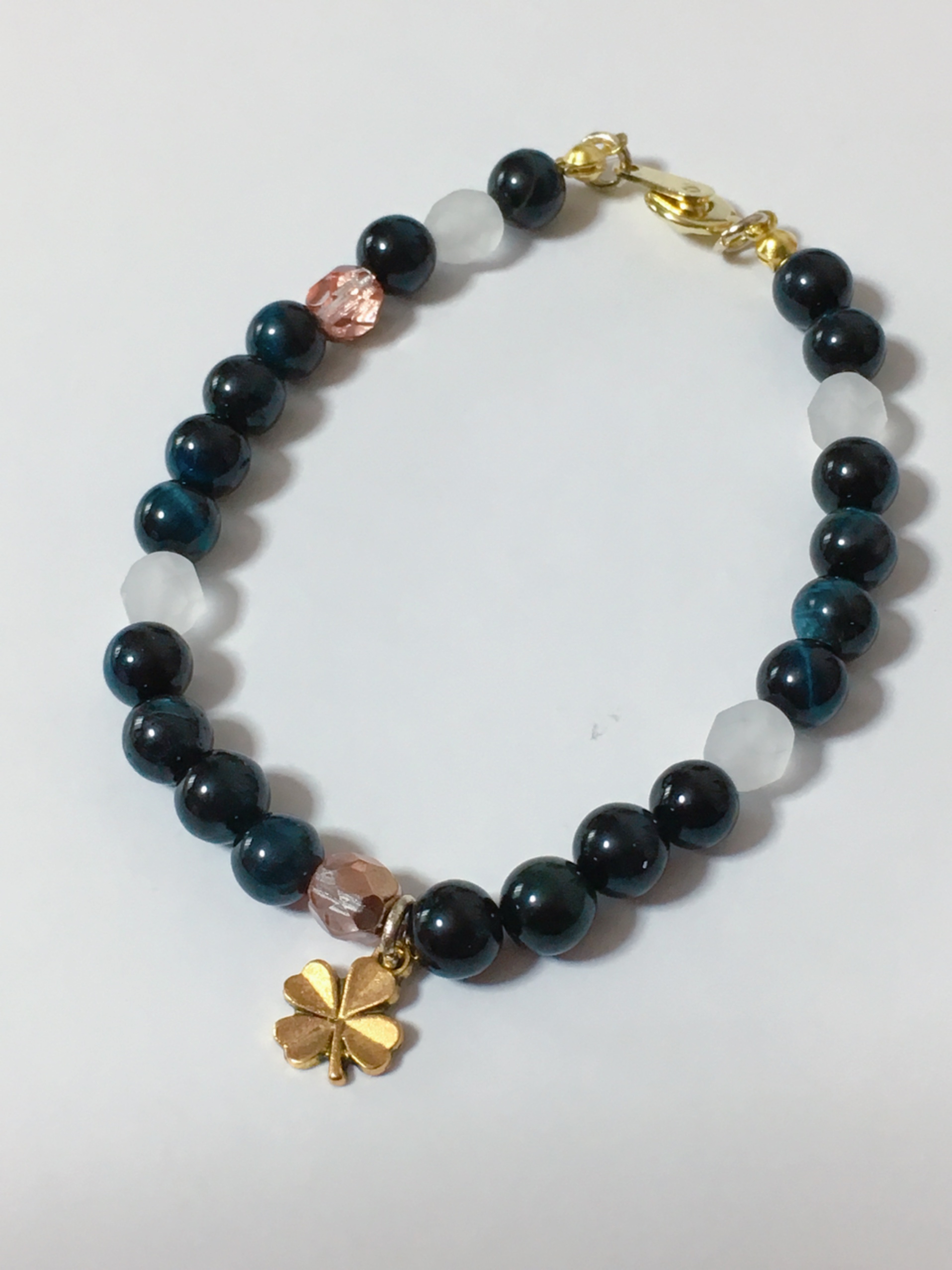 - 「RIP」 岡山に滞在していた時に作りました。ホークアイとチェコファイアを使用。すりガラスみたいな色のチェコファイアは、たくさん流した涙の粒をイメージしています。気に入ったチャームがなかったから、急場しのぎで見つけたクローバーをつけました。