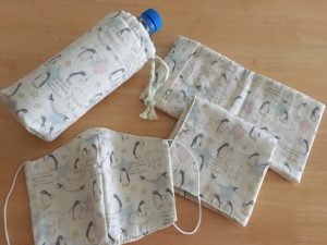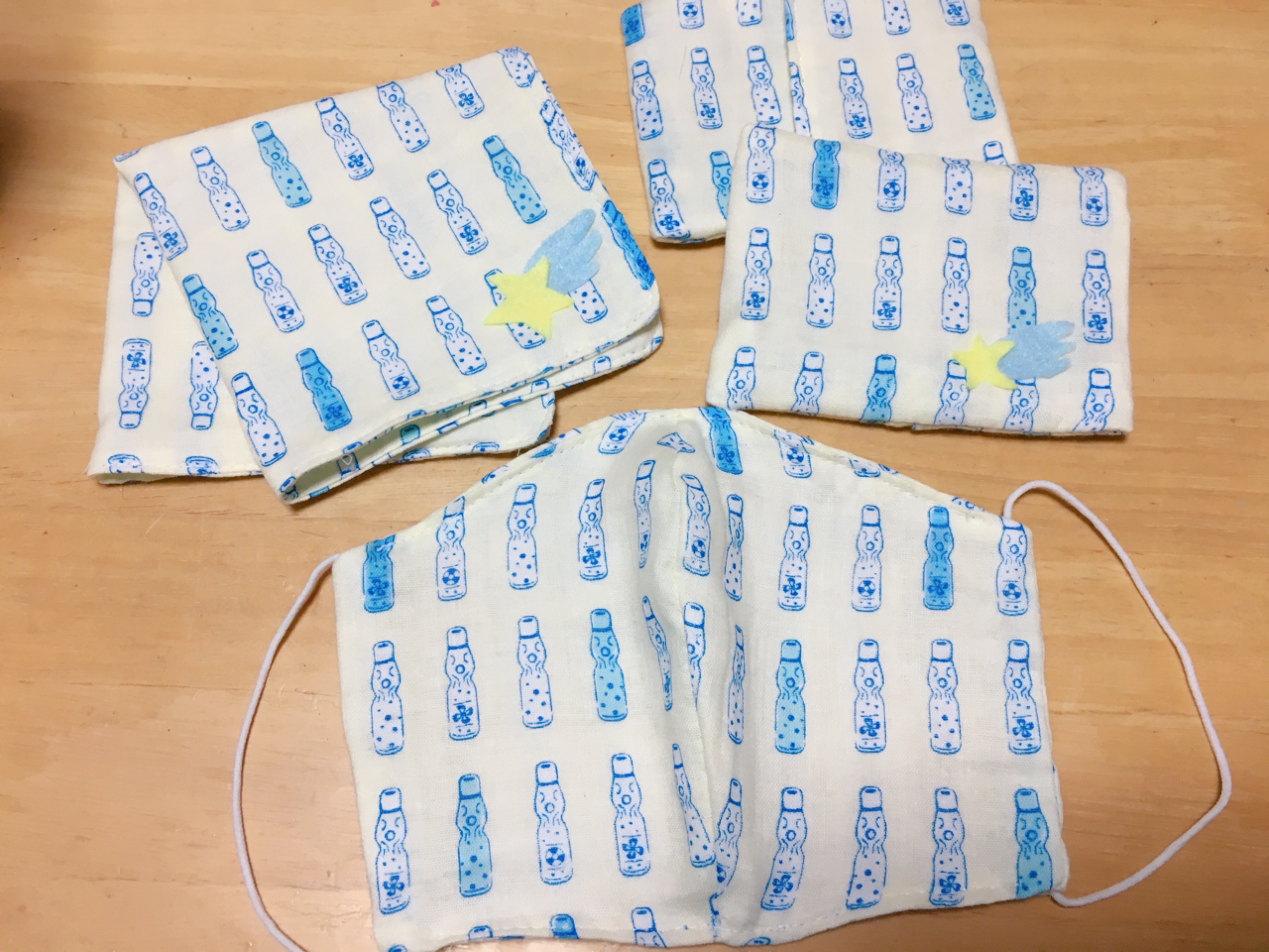 マスク、ペットボトルカバー、ハンカチ、保冷剤ケースです。