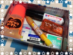 それにちょうど合う、ミニチュアサイズの糊、ホチキスの芯、消しゴムも