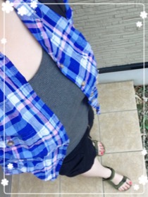 チェックシャツにリブタンクトップ、カーゴミニスカート、スポサン。