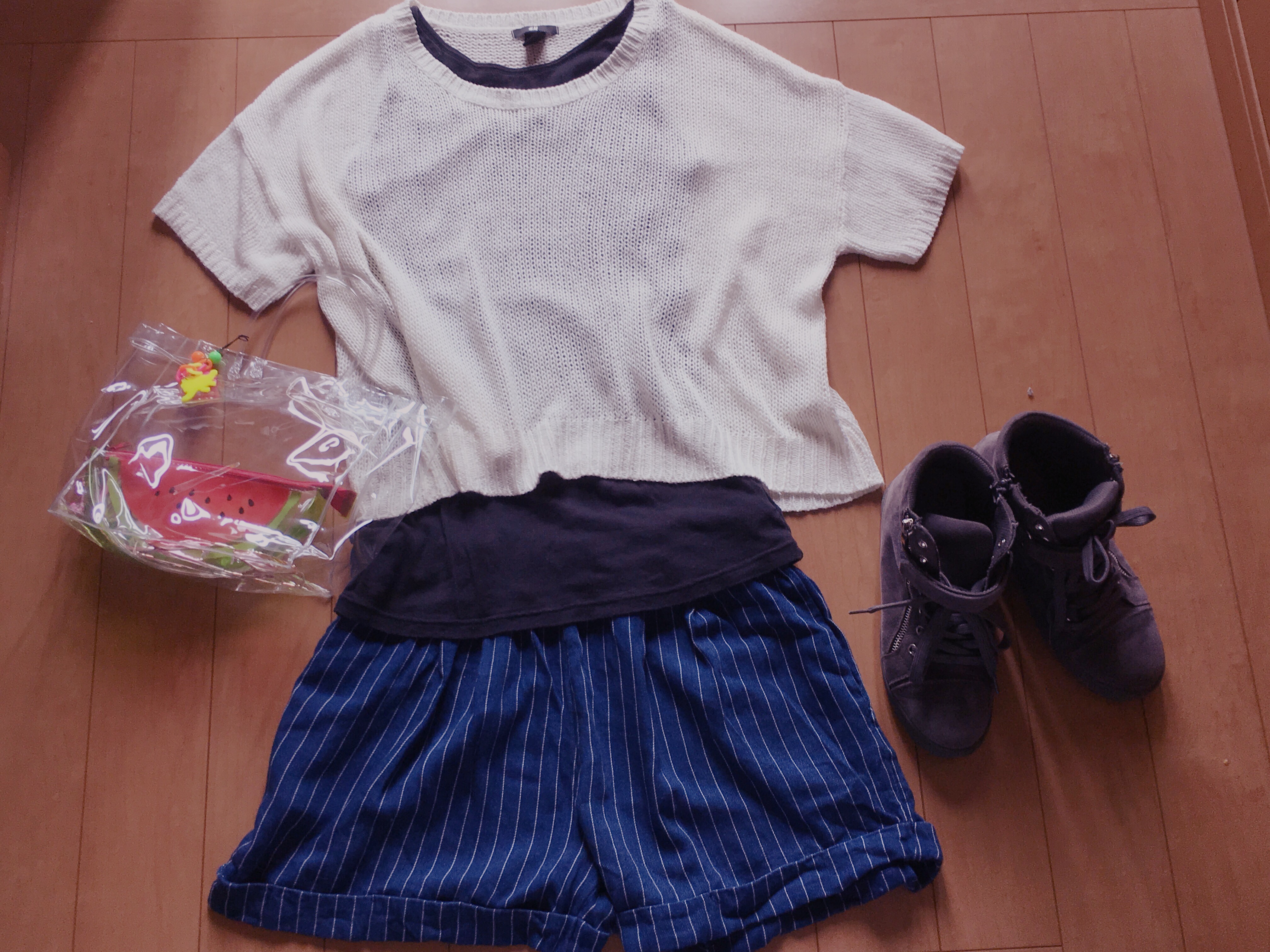 半そでニット+ブルーストライプショーパン+スニーカー。