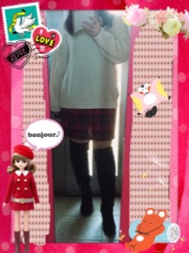 白のVネックゆるニット+赤チェックミニスカートの王道もてコーデ(笑笑
