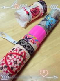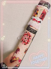 おうちにあった、セリアの手ぬぐいのハギレとか、レースとか使ったから、