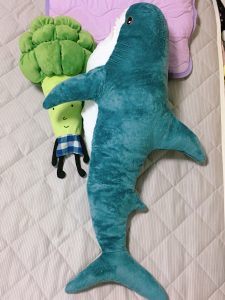 自分ちに持って帰ったサメちゃんは、わたしのベッドを陣取っちゃう大きさ~(笑笑