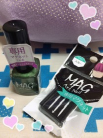 鉄の粉入りのネイルカラーで、マグネット(右)で模様をつくるの。