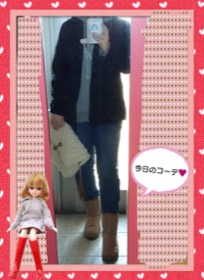 アウターゎPコート、パーカー+デニムスキニー+ムートンブーツ。