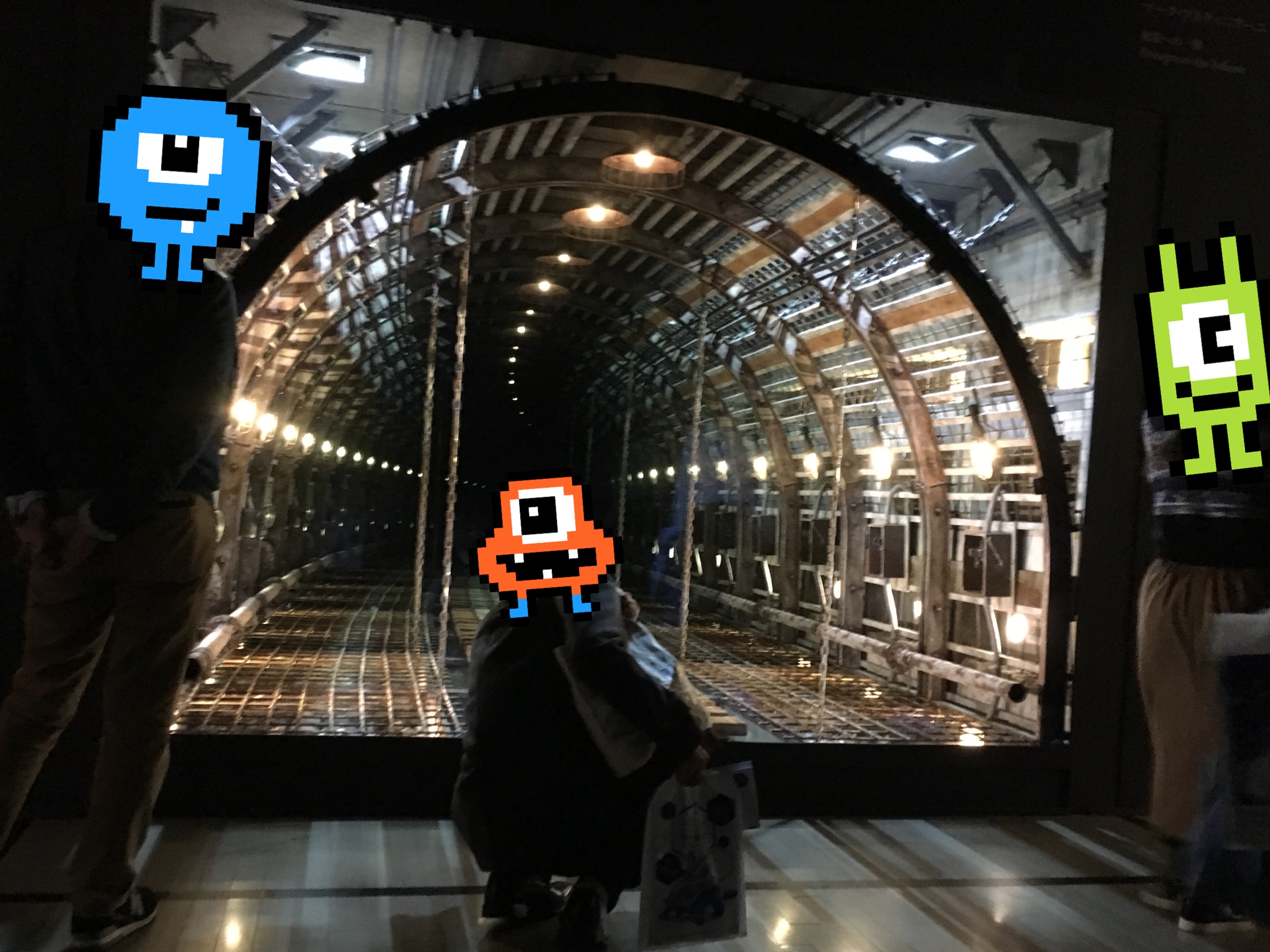 これ、鏡を使ってものすごく長ーいトンネルに見せてるんですよ。